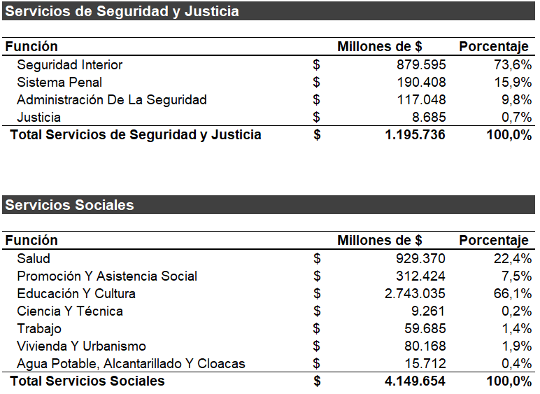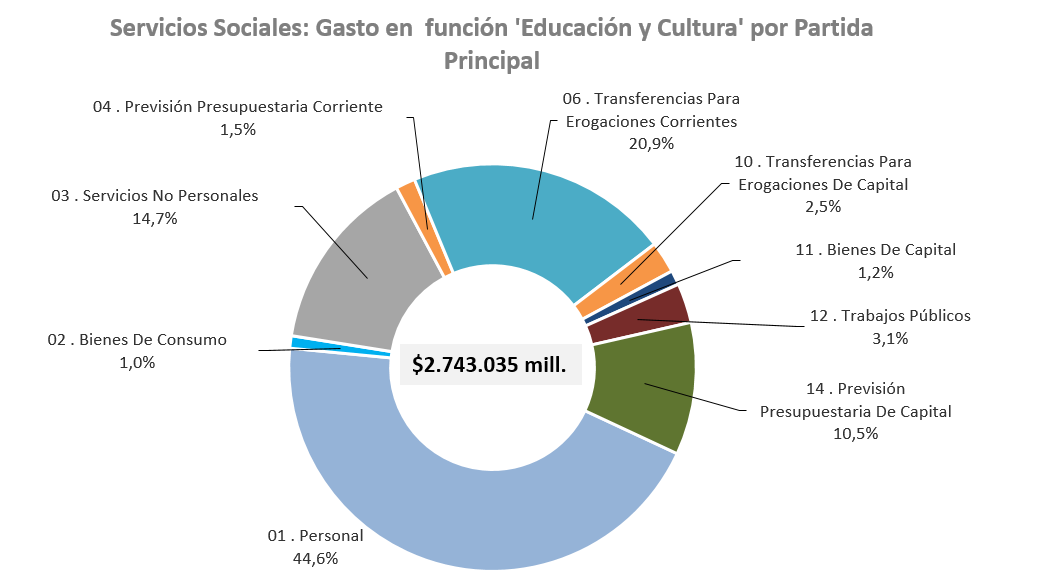 Al considerar el gasto destinado a la función ‘Servicios Sociales’, se observa que en términos de montos presupuestados, las funciones más relevantes son las de ‘Educación y Cultura’ y ‘Salud’. En el caso de ‘Educación y Cultura’ el gasto se orienta principalmente a: